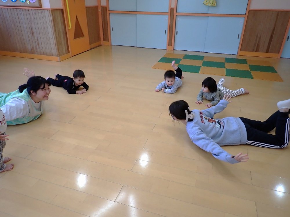 運動会で踊ったみんな大好き「ピーカーブー!」の体操の時間です🎵みんなで寝転がって手を広げ、顔を見合わせてにっこり(^^)「もっかい!」と何度もリクエストする子ども達。楽しく体を動かして遊んでいます。