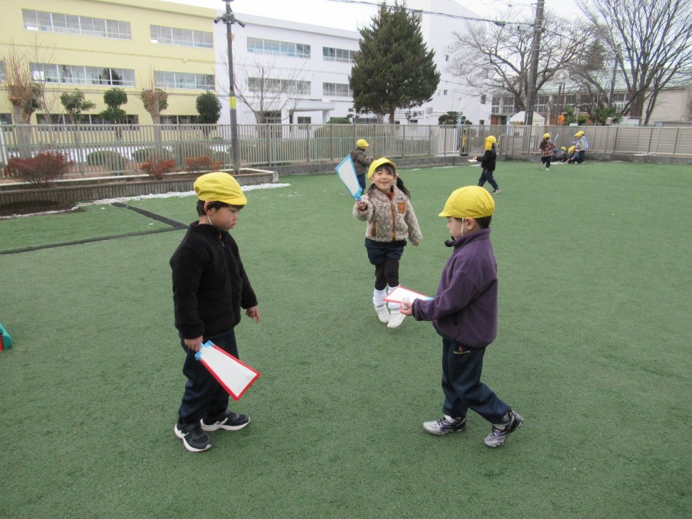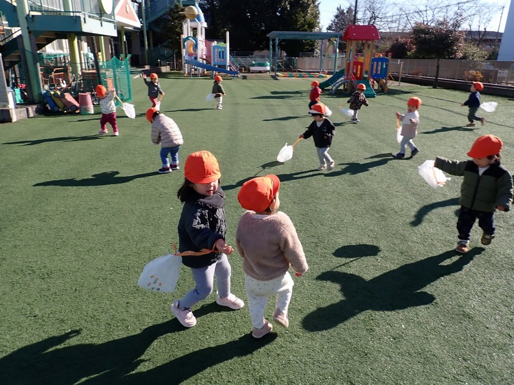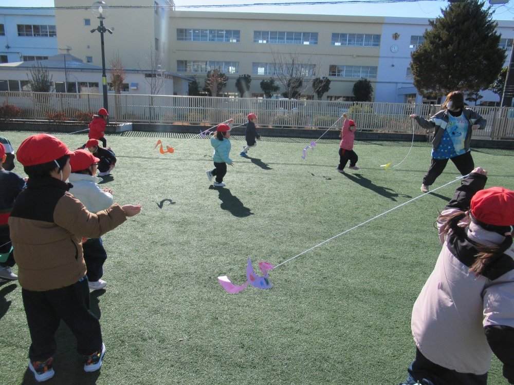 ビニール袋に子ども達がシールをペタペタ貼り、先生に持ち手を付けてもらってお手製の凧が完成!早速園庭で凧あげごっこをして遊びました(*^^*)紐を持って走ったり、歩いて凧のお散歩をしたり・・・自分で作った凧を大事そうに持っている子もいました(≧▽≦)