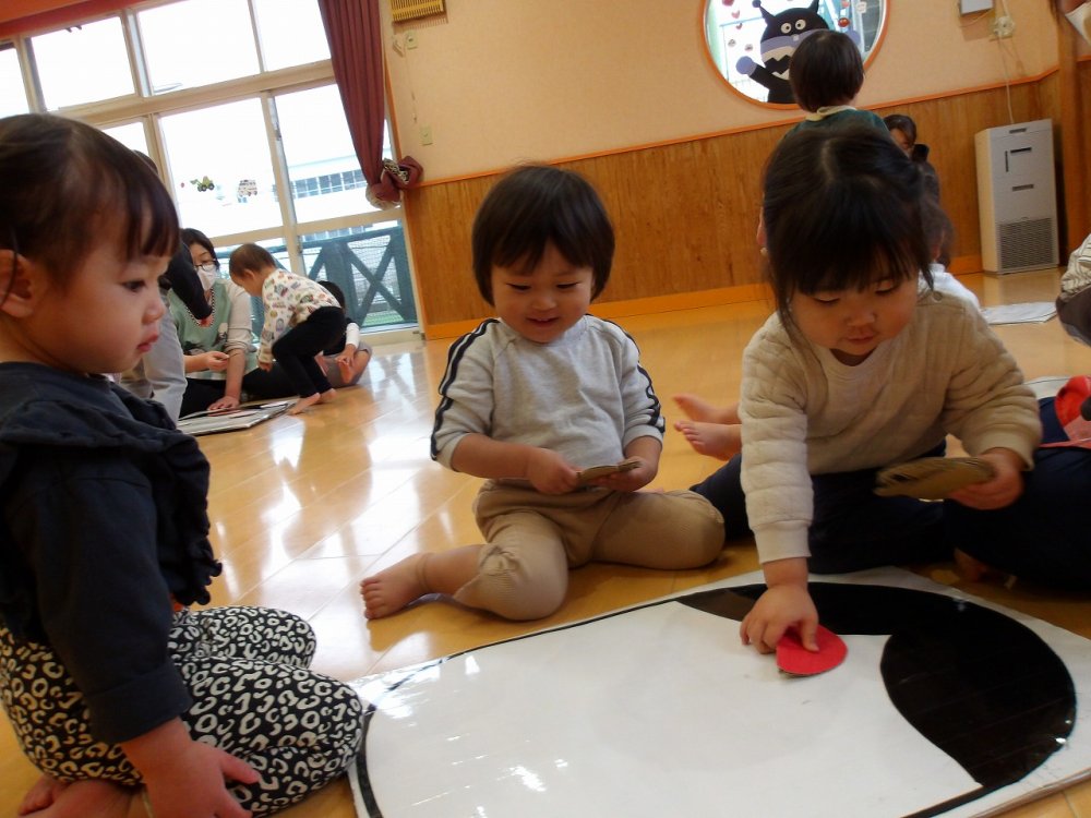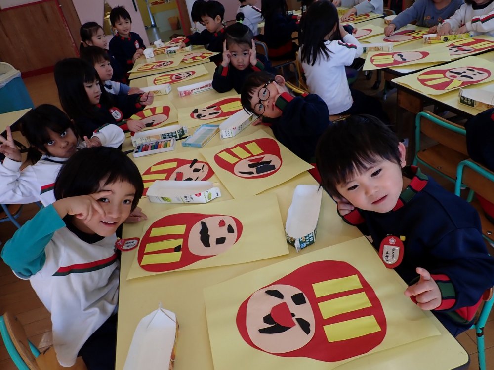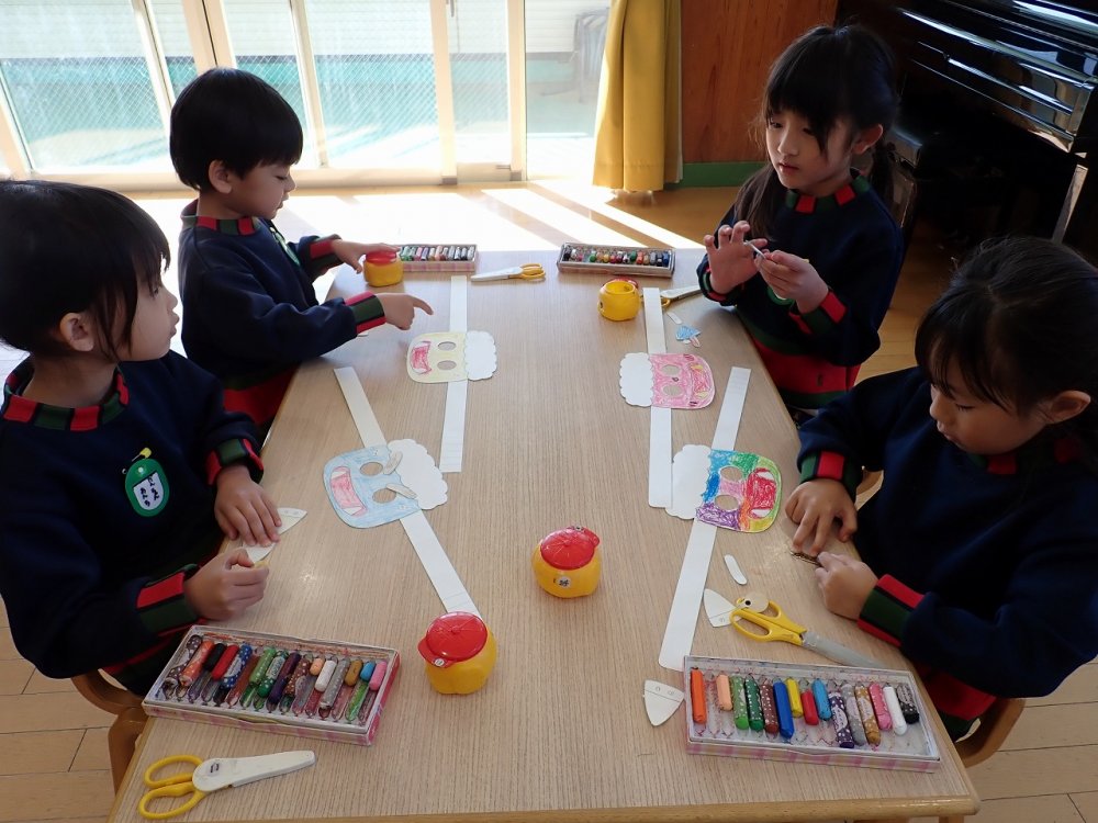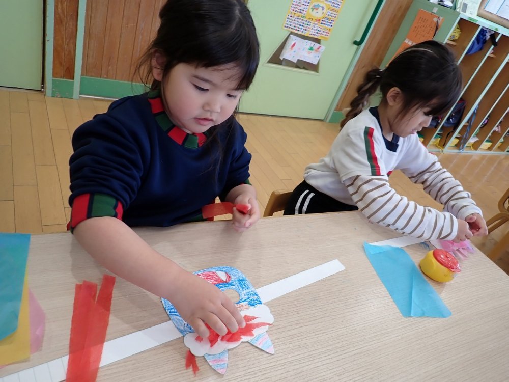 絵本の付録に色を塗り、好きな色の花紙を選んで飾り付けて鬼のお面の完成!「今年も鬼は来るかなぁ~」「節分までもうすぐだね」と話しながら作っていました( ´艸`)みんなの心の中の鬼は無事やっつけられたでしょうか(^^)??