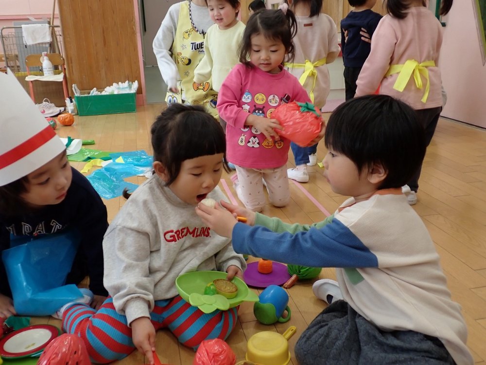 ままごと遊びを楽しんでいるさくら組のお友達。「はい、できたよ」「いただきま~す」可愛いやり取りをしながらお友達と遊ぶ姿にほっこり(*^^*)ままごとセットにはコック帽子やエプロンもあり、食べ物屋さんになって楽しんでいます🎵