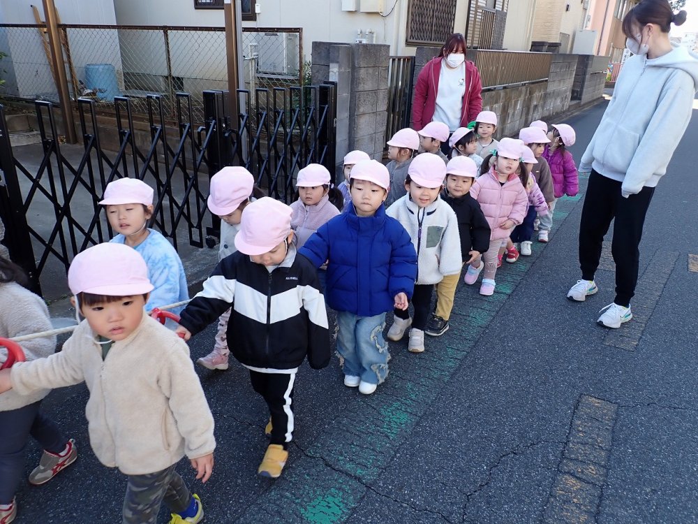 誘導ロープを握ってみんなで線路まで電車を見にお散歩に行ってきました。「電車見られるかな~🎵」軽い足取りで楽しそうに歩いていた子ども達。電車が通ると「電車来た~~!」と両手を振って大喜びでした!