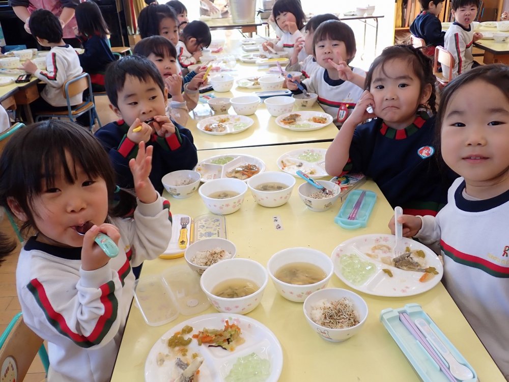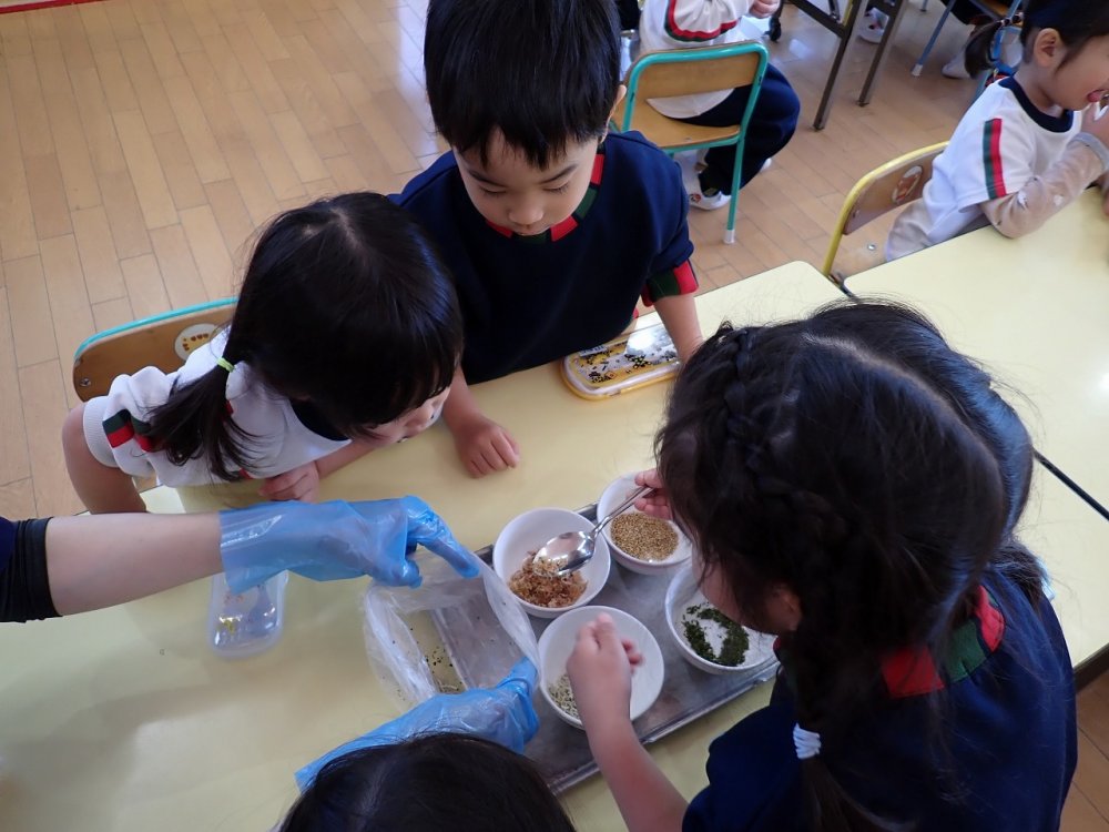 じゃこやごま、かつお節など、自分で好きな具材を選んで袋に入れて、シャカシャカ振って・・・オリジナルふりかけの完成!給食でごはんにかけて食べました☆「小魚には骨を強くするカルシウムが入っているよ」という話を聞き、食べたらすぐ「お!強くなった!」とすぐに効果を実感?!している可愛いばら組さんでした笑