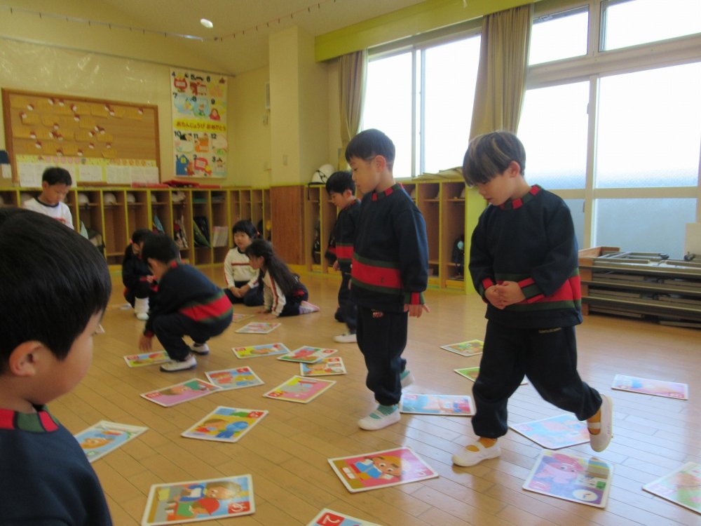 大きなかるたで遊んでいるひまわり組のお友達。絵札が大きいので部屋中を歩き回って探していました!まだ絵をヒントに探している子が多いですが、自分の名前のひらがなは読めるよ!という子もいます。かるたを通して少しずつひらがなへの関心が持てたらいいなと遊びに取り入れています(*^▽^*)