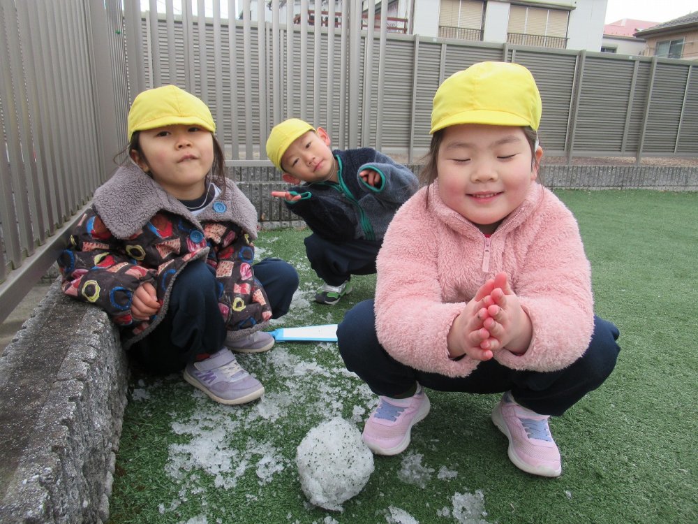 お正月遊びで園庭で羽子板に挑戦しました!お友達と続けて打つのはまだ難しいですが、羽子板に羽が当たるととっても嬉しそうでした✨この日は雪が園庭の隅に残っていて、ちょっぴり雪遊びも出来ました🎵