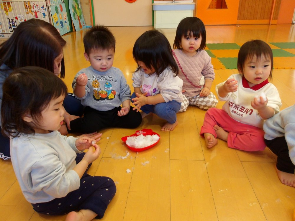 園庭にうっすら積もった雪をお部屋に持ってきました~