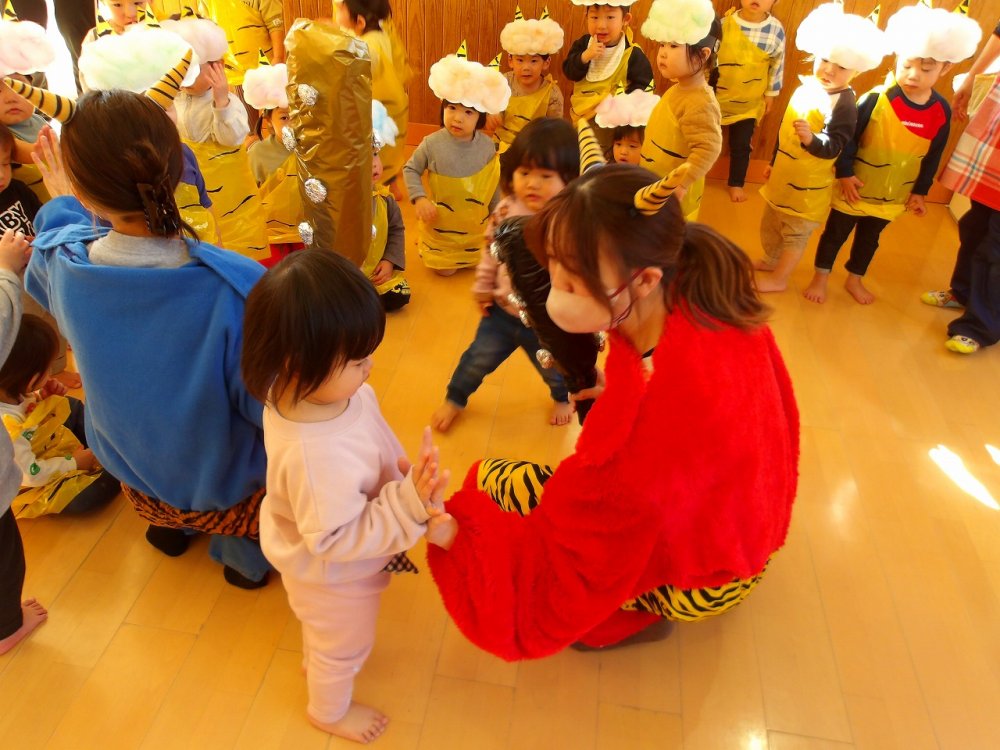 イエーイ!とタッチしたり「鬼のパンツ♪」の歌に合わせて踊り楽しく過ごしました(^◇^)