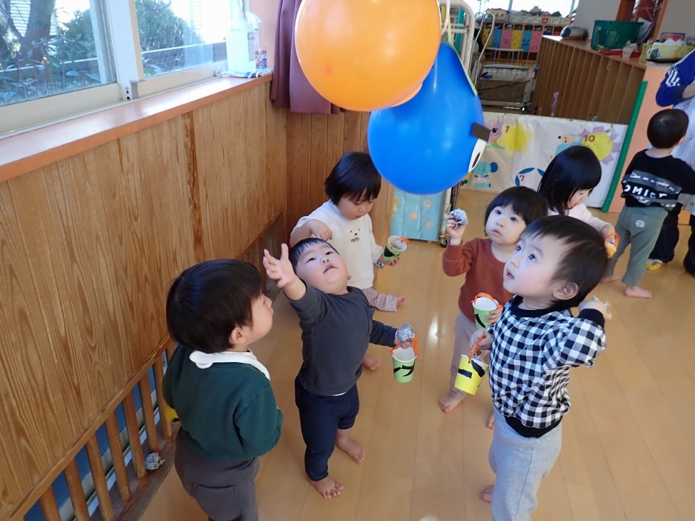 風船でできた鬼に新聞紙豆を当てて鬼退治をしました。
