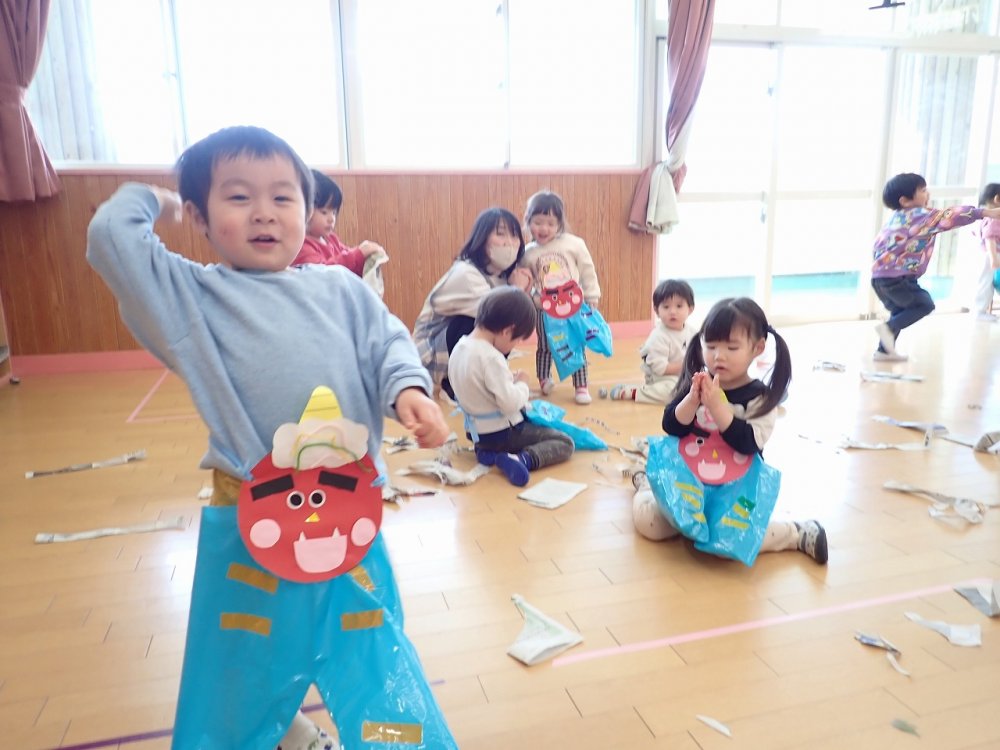 自分たちで作った鬼のエプロンを付けて新聞紙豆で「鬼は~外!」と豆まきをして遊びました。