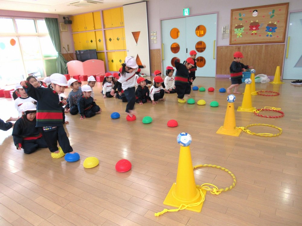 バランスボールに乗った後、ボールをフープに入れてボール運びをして楽しみました。